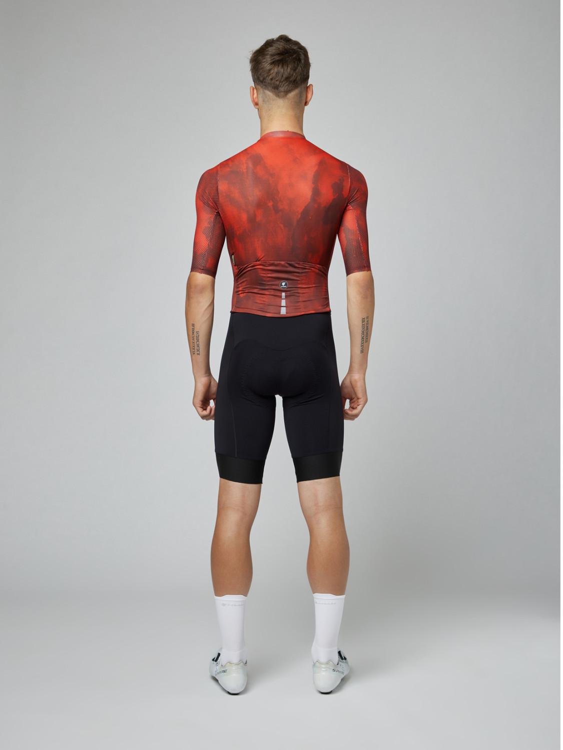 Laser-cut heat-taped sleeves that improve aerodynamics and keep the fabric in place while pedaling.